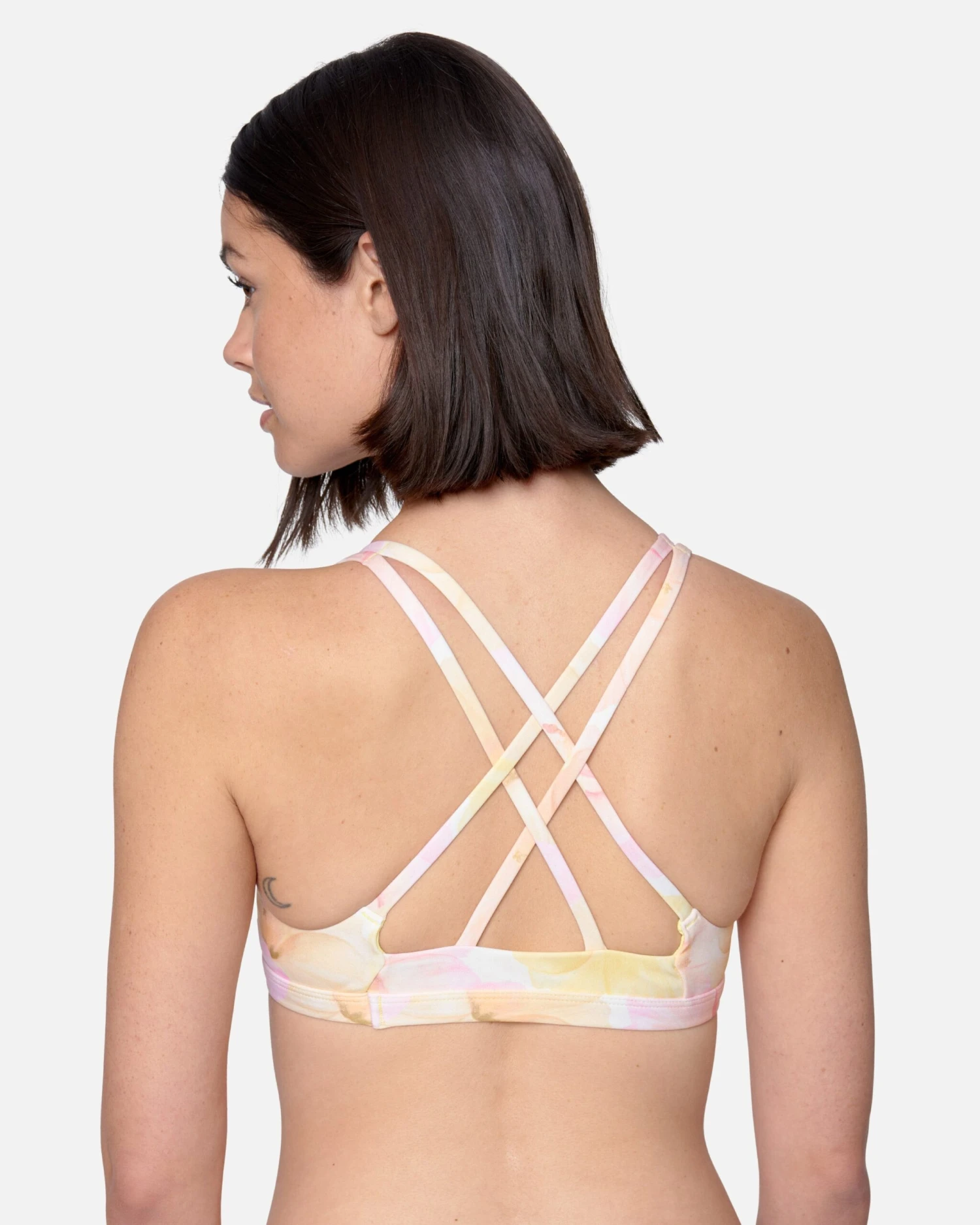 - Bikini top with fixed cross back straps and front keyhole